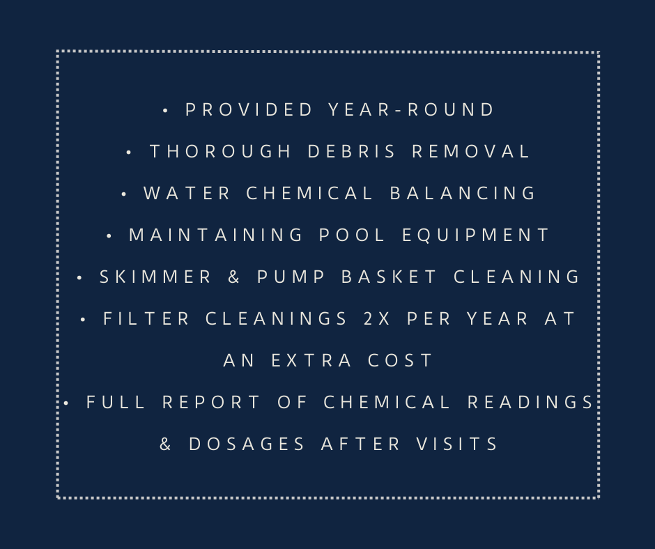 This year-round service includes a full weekly cleaning of your pool, an inspection of the equipment and a full chemical reading and balancing to keep your pool perfectly maintained every time.